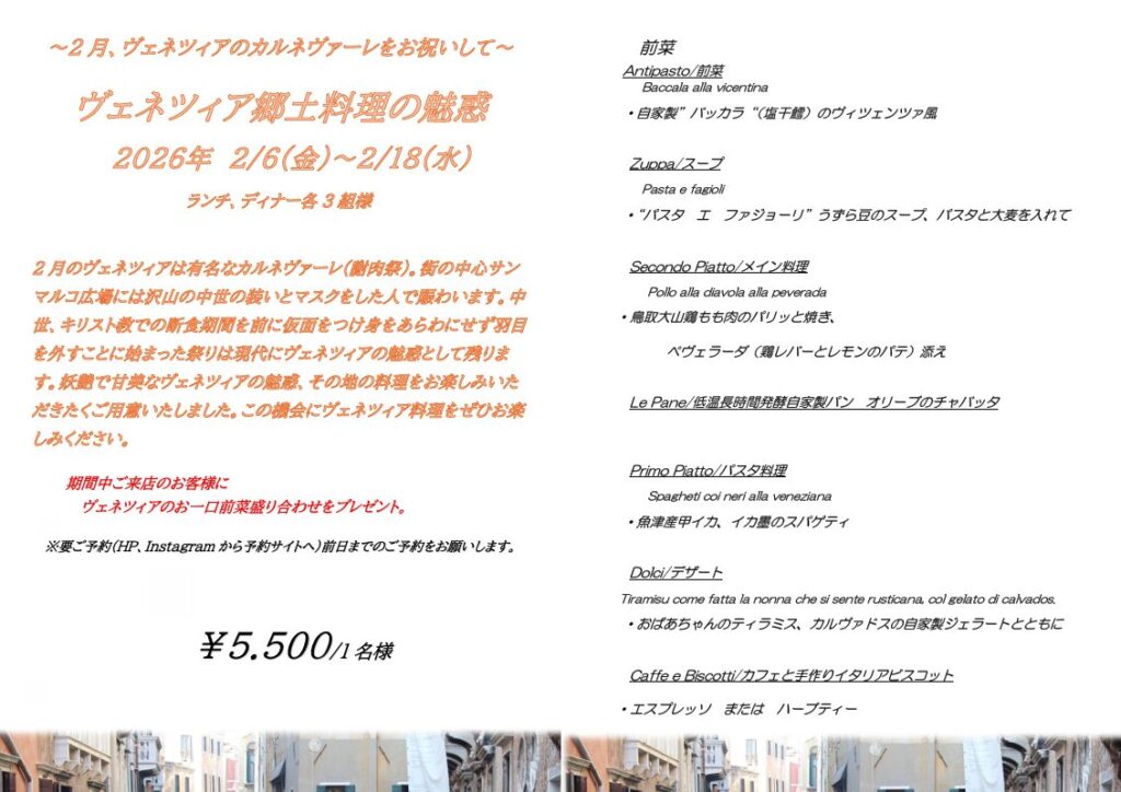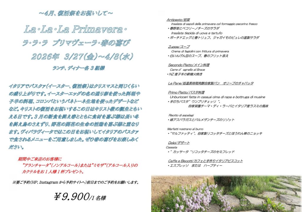 いつもヴィバラヴィータをありがとうございます。イタリアでは冬から春にかけてイベントが目白押しです。ヴィバラヴィータではこのイベントをお祝いしまして期間限定の特別メニューをご用意しました。この機会にぜひ、春に向けての食材とイタリアのイベントをお楽しみください。