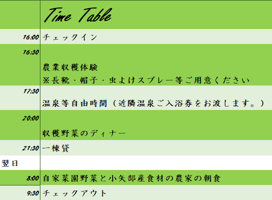 ・農体験(収穫をメインとした1時間の農体験。雨天の場合はパン作り体験に変更。)